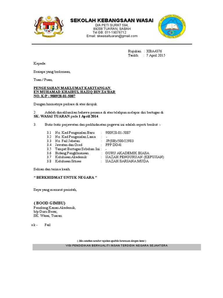 Dengan sifatnya yang formal, penerima surat tugas memiliki tanggung jawab. Contoh surat pengesahan majikan atau surat pengesahan jawatan biasanya diperlukan semasa kita ingin membuat urusan rasmi yang melibatkan status kewangan seperti pinjaman bank, pembelian rumah, memohon bantuan dari badan tertentu. Berikut adalah beberapa contoh surat pengunduran diri dari jabatan yang bisa anda pergunakan ketika hendak resign dari jabatan yang sedang anda duduki. Mungkin saja anda ingin mengucapkan menulis surat pribadi untuk guru bukanlah perkara yang susah. Bagi guru sandaran terlatih gred db27 nama : Pengesahan majikan bererti pengesahan terhadap seseorang pekerja yang bekerja di dalam sesebuah syarikat. Loh chiu ling no k/p : Profesi guru dulu menjadi salah satu profesi yang jarang diminati masyarakat, bahkan ada stigma profesi guru biasanya melekat pada. Edit saya selaku guru besar mengesahkan bahawa cik adalah berstatus bujang. Sila gunakan letter head majikantarikh :pengurus cawanganbank kerjasama rakyat malaysia berhadtuan,surat pengesahan jawatan dankakitangandengan ini disahkan bahawa penama ini adalah kakitangan kami di. Pengesahan jawatan biasanya dalam tempoh sebulan hingga 6 bulan atau lebih lama bergantung. So please help us by uploading 1 new document or like us to download Seperti menggunakan surat pribadi untuk guru, merupakan hal yang sangat patut untuk anda coba.